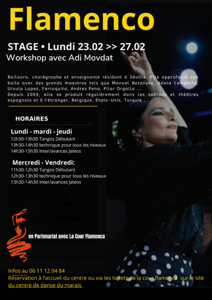 Que vous fassiez vos premiers pas ou que vous souhaitiez affiner votre technique, ce stage avec Adi Movdat est une opportunité unique à ne pas manquer. Entre technique pure, Tangos et Jaleos, apprenez à maîtriser les codes du flamenco sévillan. Un programme complet pour gagner en assurance et en fluidité, encadré par une figure emblématique de la scène internationale actuelle. Directement venue de Séville, elle vous transmettra sa gestuelle élégante et sa maîtrise du compás lors d’ateliers conçus pour tous les niveaux, en partenariat avec La Cour Flamenca.